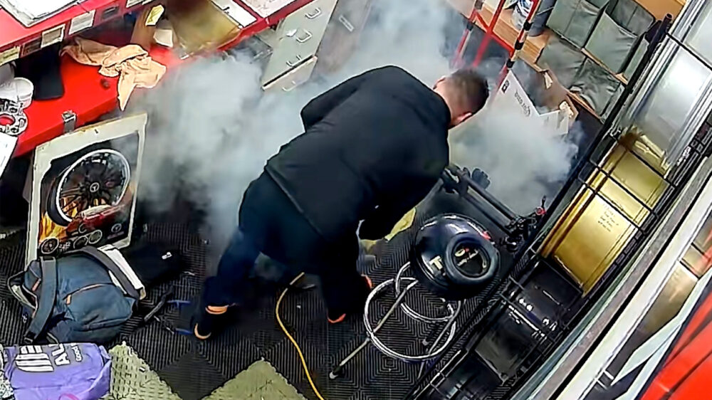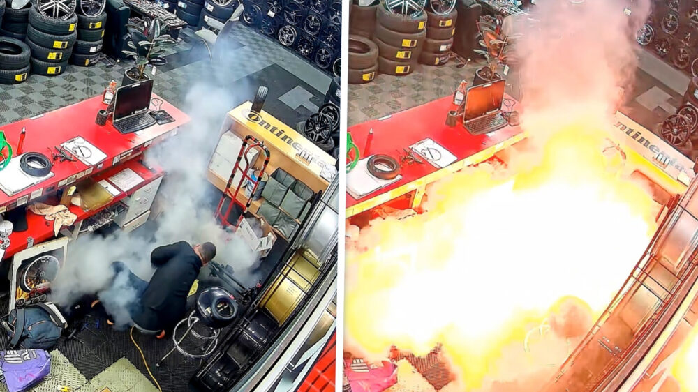 De beveiligingsbeelden laten zien hoe de scooter langzaam begint te roken, waarna de monteur wijselijk afstand neemt. Nog geen seconde later verandert de batterij in een schreeuwende vuurbal die halve werkplaats mee lijkt te nemen.
