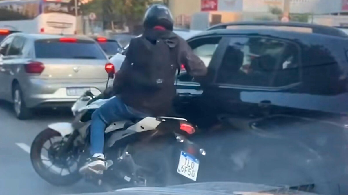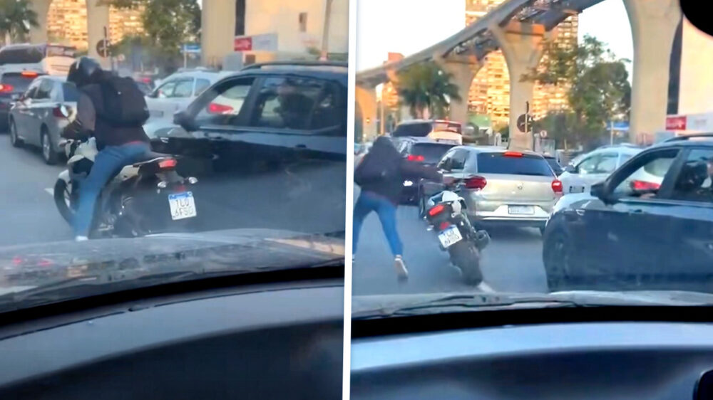 Een motorrijder probeerde dinsdagmiddag een automobilist te beroven op de drukke Avenida Jornalista Roberto Marinho in de zuidelijke zone van São Paulo. De poging liep volledig uit de hand.