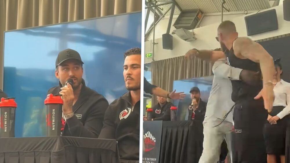 Dinsdagmiddag stond de staredown gepland tussen Dave Roelvink en DieTim, die het op 5 oktober zullen uitvechten in de ring tijdens de Videoland-productie Boxing Influencers. Dave weigerde echter op te staan om zijn rivaal diep in de ogen te kijken. Toen hij spottend zei dat "de Ggz-instelling een patiënt kwijt is", ontstond er complete kortsluiting in de bovenkamer van Tim. “Kom hier, broer! Ben je een sukkeltje?” blèrde hij, terwijl Melvin Manhoef hem in toom moest houden als een driftige peuter. Dit belooft heel wat goeds 5 oktober: