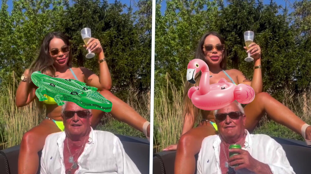 Deze oude kakker met een buik vol bitterballen en een ego groter dan z’n sloep neemt het er lekker van. Blikje goedkoop bier in de hand, zonnebril op de neus en achter hem een opgeblazen stranddecoratie in bikini die net uit de siliconenfabriek is komen rollen. Dit is dus wat er gebeurt als je te veel vrije tijd, te weinig smaak en precies genoeg geld hebt om jezelf compleet voor lul te zetten. Groot gelijk heeft 'ie!