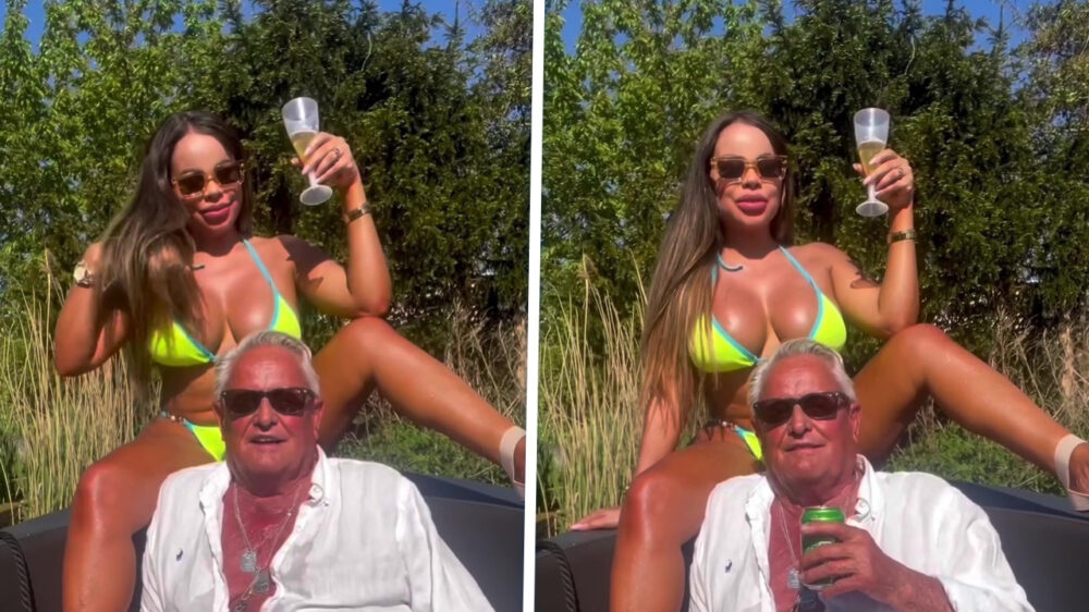 Deze oude kakker met een buik vol bitterballen en een ego groter dan z’n sloep neemt het er lekker van. Blikje goedkoop bier in de hand, zonnebril op de neus en achter hem een opgeblazen stranddecoratie in bikini die net uit de siliconenfabriek is komen rollen. Dit is dus wat er gebeurt als je te veel vrije tijd, te weinig smaak en precies genoeg geld hebt om jezelf compleet voor lul te zetten. Groot gelijk heeft 'ie!