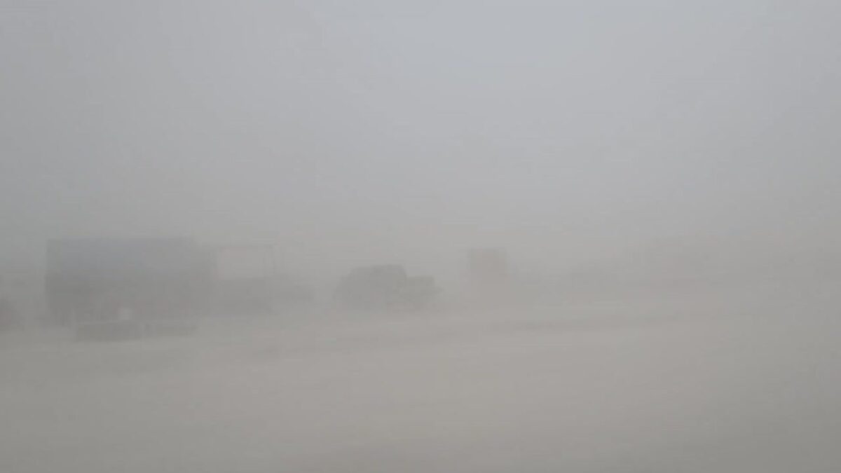 Op beelden die online circuleren, zie je het zand horizontaal voorbijvliegen, compleet met witte stofmuren die het zicht nagenoeg blokkeren. In de chaos worden schaduwzeilen van tenten afgerukt, als ze überhaupt nog overeind staan. Crews lopen rond in stofmaskers en skibrillen alsof ze midden in Chernobyl staan.