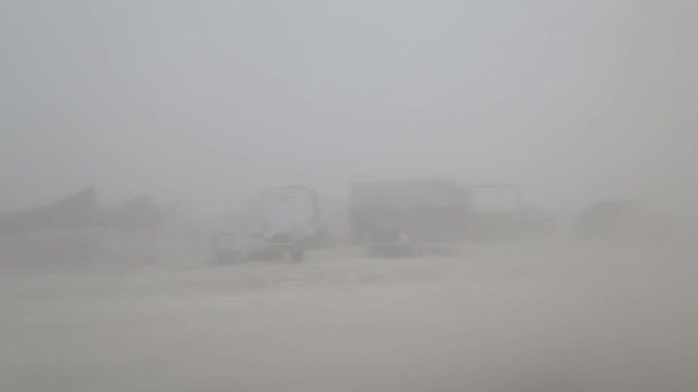 Op beelden die online circuleren, zie je het zand horizontaal voorbijvliegen, compleet met witte stofmuren die het zicht nagenoeg blokkeren. In de chaos worden schaduwzeilen van tenten afgerukt, als ze überhaupt nog overeind staan. Crews lopen rond in stofmaskers en skibrillen alsof ze midden in Chernobyl staan.