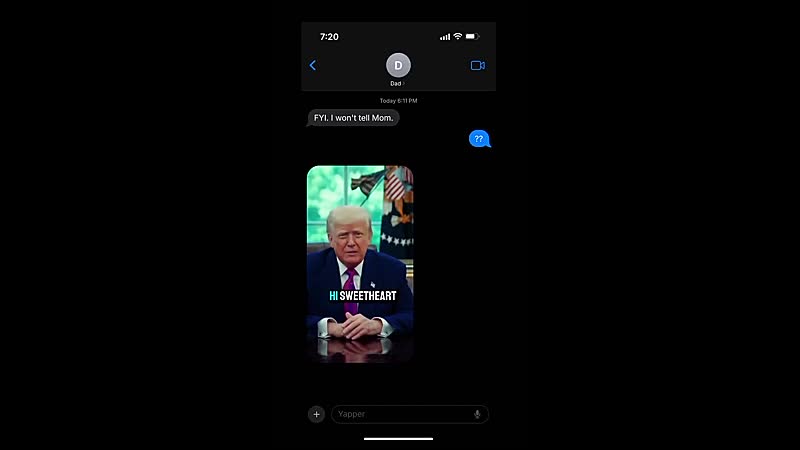 Een vader treft het speeltje van zijn dochter in de badkamer en kiest ervoor om dat niet gewoon te appen, maar via een AI-video van Trump duidelijk te maken. In de video grapt “Trump” dat ze haar green goblin beter kan opbergen, omdat haar broertje ook vaak in de badkamer zit, en dat ze rustig aan moet doen want ze traint niet voor de Olympische Spelen. Het fragment ging razendsnel rond en leverde duizenden lachende reacties op.