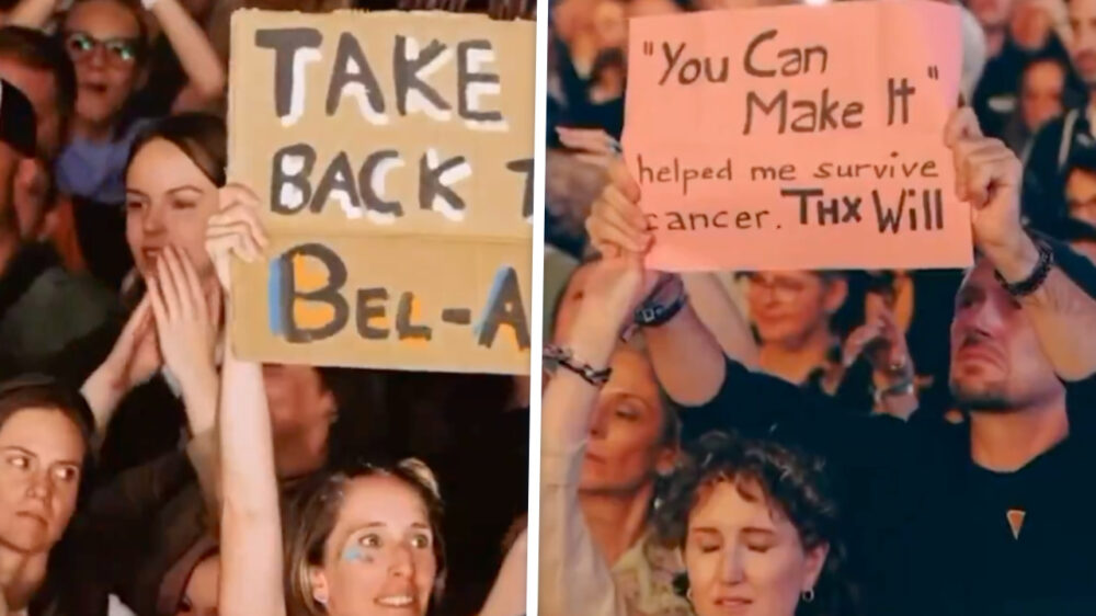 Het ging mis toen Smith trots de video deelde met de boodschap: “My favorite part of tour is seeing you all up close. Thank you for seeing me too.” Alleen lijkt hij niemand echt te zien, want de aanwezigen hebben meer weg van glitchy avatars dan mensen. Eén bord in het publiek leest “FR6SH CRINCE”, wat zelfs voor de fanatiekste aanhanger lastig te verklaren is. Een ander bord zegt: “You can make it. Helped me survive cancer. Thx Will”, vastgehouden door iemand met een pijnlijk gezicht en nét iets te veel vingers.