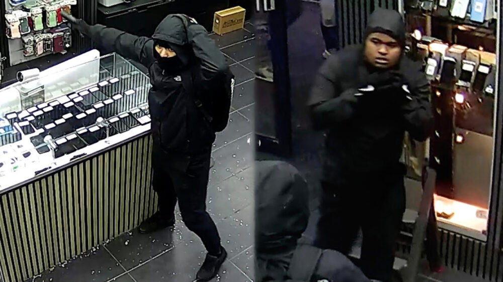 Ze waren beide in het zwart waarbij de wapentrekker een jas van The North Face en een rugtas van Under Armour. droeg Zijn niet al te snuggere kompaan had Nike-gympen en handschoenen aan. De slachtoffers probeerden zich nog te verweren, maar kozen uiteindelijk eieren voor hun geld toen het geweld escaleerde. Hoeveel telefoons er precies zijn buitgemaakt is nog niet bekend.