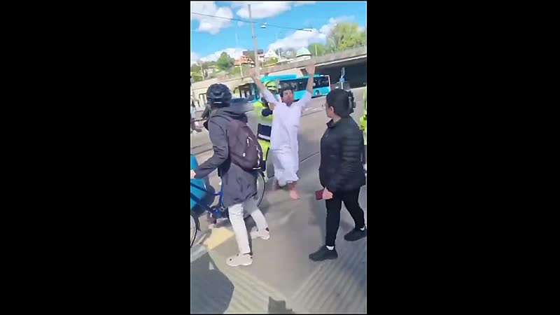 Man probeert te bidden op tramspoor, wordt woest wanneer iemand hem wegtrekt