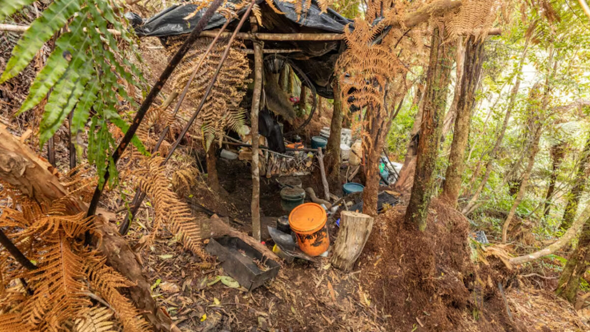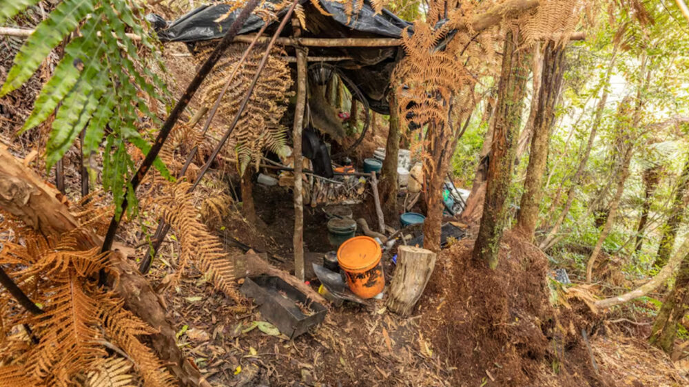 De politie liet dinsdag foto’s zien van het tweede kamp dat Phillips zou hebben gebruikt. Geen camper of tent met barbecue: een aftandse hut van takken, ergens diep in de bossen van Marokopa. De tent lag achteraf, was moeilijk te zien én lastig te bereiken. Volgens rechercheur Andrew Saunders was het ‘een zeer sombere, slecht verlichte plek’. Binnen stonden een draagbare kookplaat, een gasfles en lege flessen gin en ijskoffie.