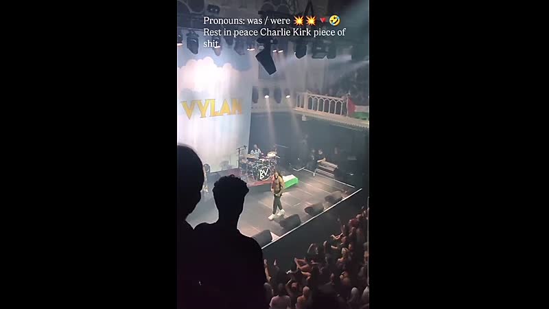 Daarna gooide 'ie er ook nog een "Rest in peace Charlie Kirk, you piece of shit!" uit, gevolgd door gejuich van het publiek en wat kutmuziek.