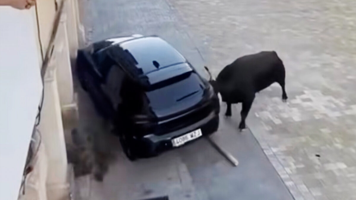 Stier sloopt geparkeerde Peugeot tijdens stierenrennen in Guadalajara