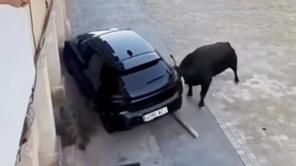 Eén stier had er geen boodschap aan en richtte zich op de achterzijde van de auto. Die kwam vervolgens een halve meter van de grond en werd zonder problemen een paar meter verplaatst. Een boompje dat in de weg stond overleefde het ook niet. Volgens de Spaanse berichtgeving zou het model zo’n 1.200 kilo wegen, wat het allemaal niet minder indrukwekkend maakt.