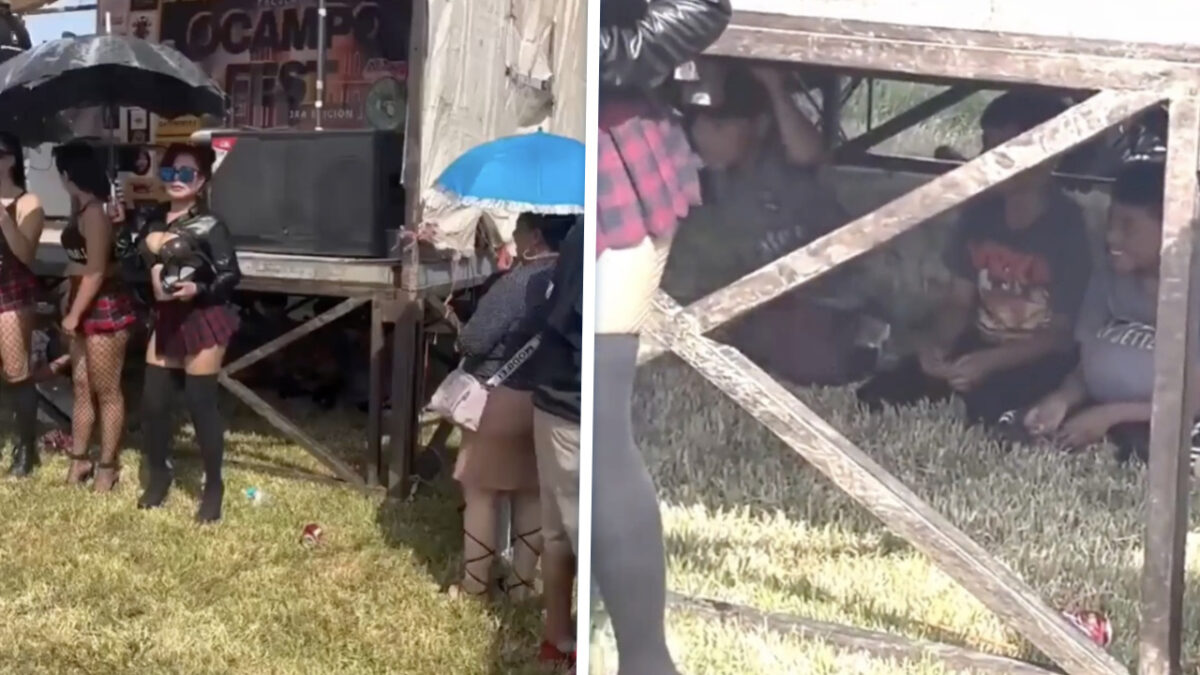 Terwijl de rest van het publiek stond te zweten in de volle zon, hadden deze slimmeriken de jackpot gevonden: een gratis schaduwplek direct onder het podium.