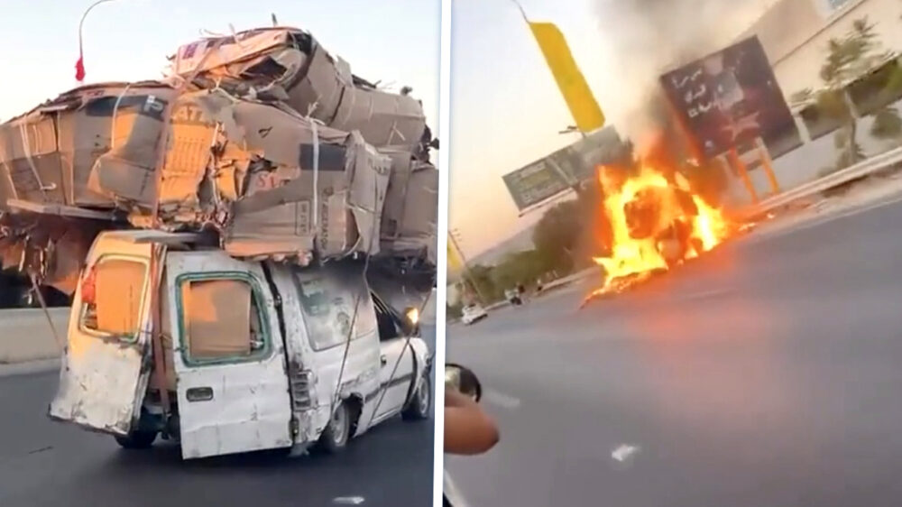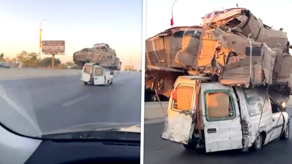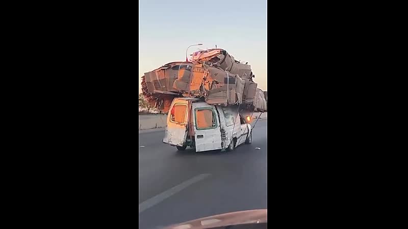Waarom zou je vijf keer heen en weer rijden als het ook in één keer kan? Dát moet met name de chauffeur van dit totaal gesloopte koekblik gedacht hebben.