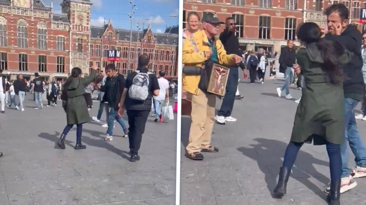 Straatprediker Yerani aan d'r haren over straat gesleurd in Amsterdam