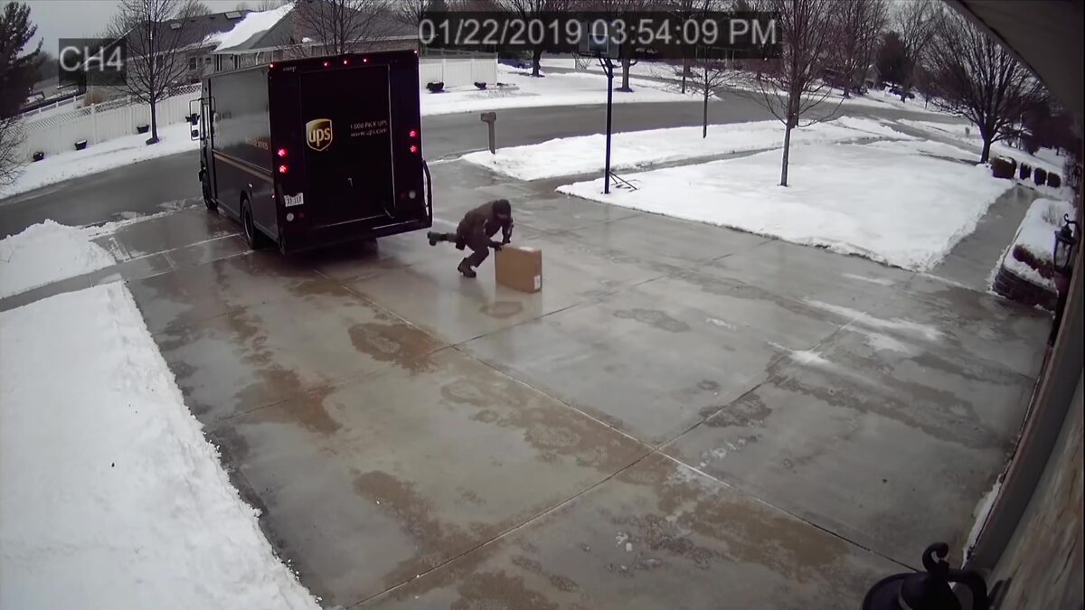 Op een spekgladde oprit heb je het als pakketbezorger niet gemakkelijk. Gelukkig beschikt deze kerel over prima curlingskills.