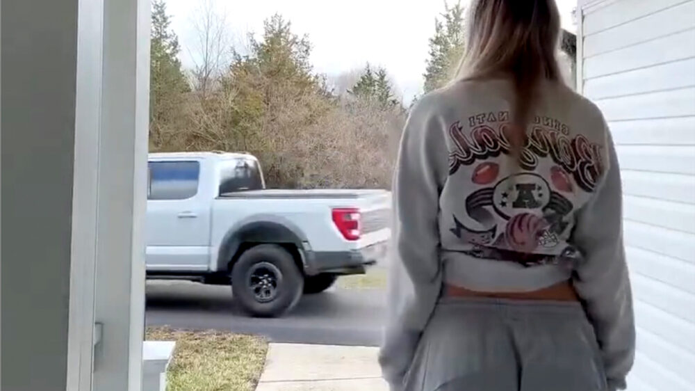 Niks zo prettig als je vent even uitzwaaien wanneer hij naar z’n werk gaat. Alleen doet deze dame dat net wat anders dan met een simpel groetje. Meneer rijdt al voorbij maar ziet het nét te laat, dus snel even in z’n achteruit. Skrrtt!