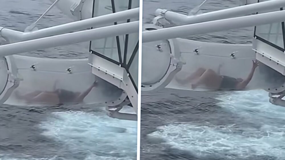 Een ritje in een drijvend pretpark liep net even anders af voor een vrouw op een cruiseschip voor de kust van Canada. Ze raakte vast in een glazen buisglijbaan die zo'n 50 meter boven zee uitsteekt. Op beelden is te zien hoe ze hulpeloos op haar rug in het doorzichtige stuk ligt, terwijl ze met gestrekte armen probeert vooruit te glijden.