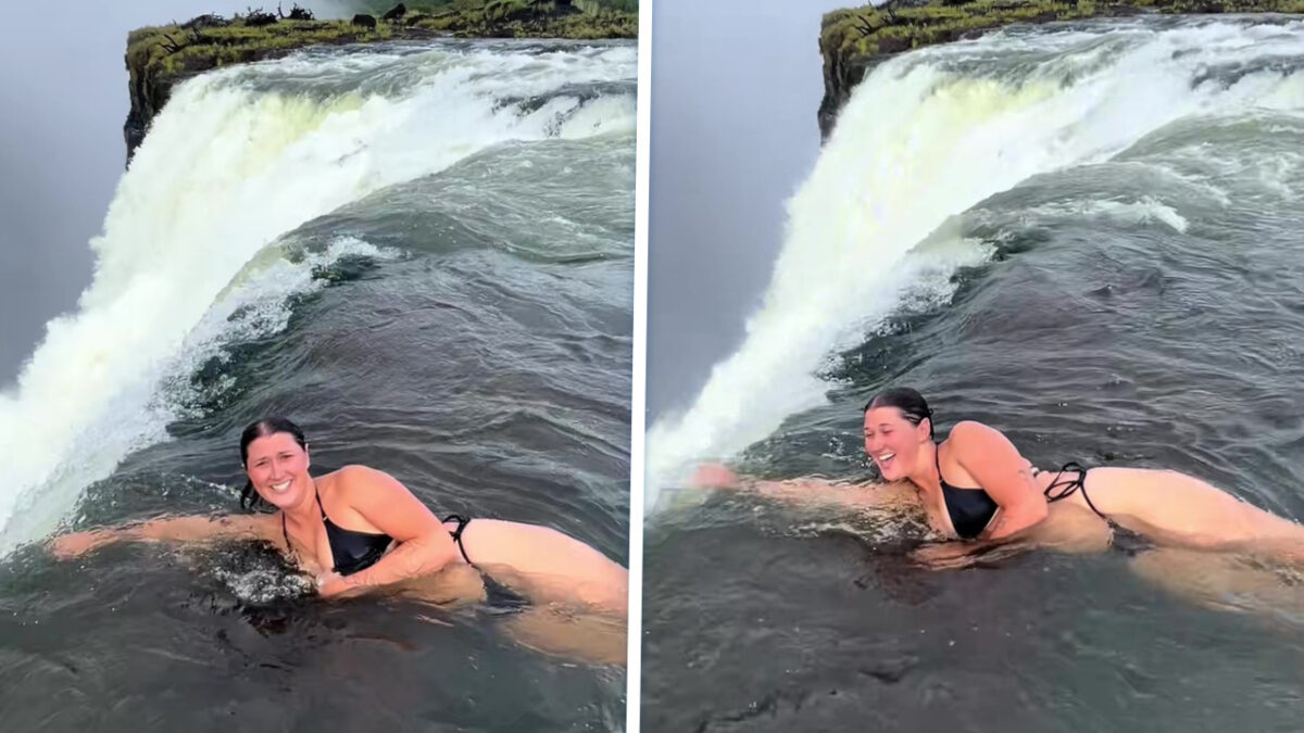 Geen standaard subtropisch zwembad voor deze dame, maar gewoon met je bikini aan doodleuk in de Devil’s Pool dobberen. Glimlachje erbij, over het randje bungelen en hopen dat je niet ter pletter valt. 👏