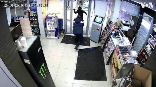 Tankstationmedewerker gebruikt dweil als ze wordt gepeppersprayed door overvaller Random