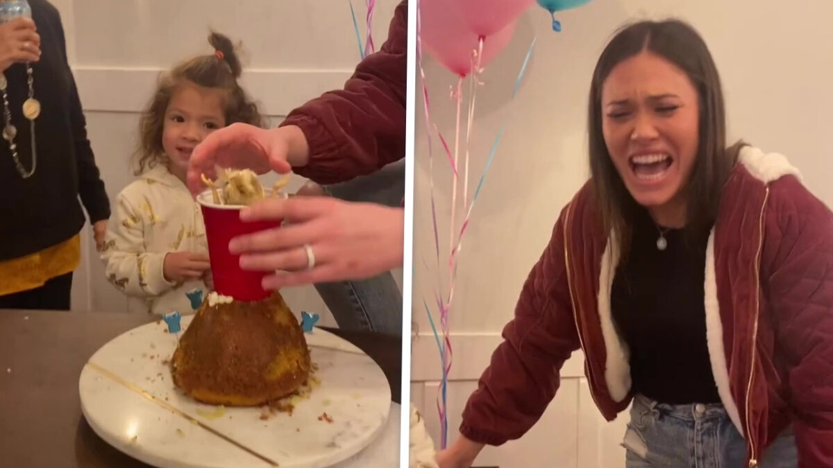 Moeder pist in haar broek van het lachen tijdens mislukte taartonthulling