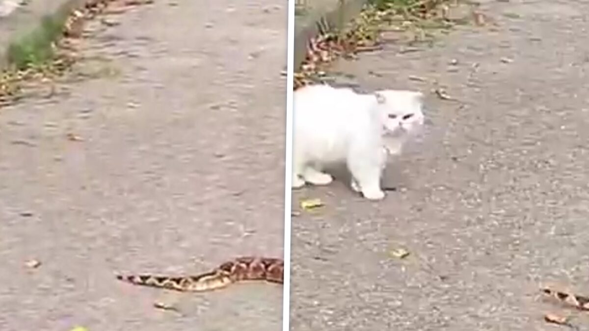 Op videobeelden is te zien dat het niet alleen mensen zijn die deze urban jungle niet zagen aankomen. Ook een buurtkat kwam even inspecteren wie daar ineens kronkelend de stoep claimde. Oog in oog met een wurgslang zijn is voor de meeste katten reden om gas te geven, maar deze koos voor het tegenovergestelde. Gelukkig voor de kat (en zijn fans) had de boa blijkbaar al geluncht.