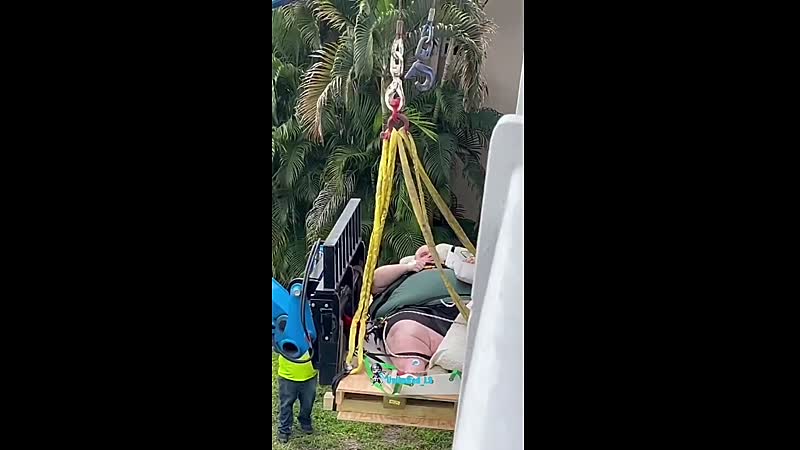 In Florida is een man van naar schatting 270 kilo met een hijskraan uit zijn appartement getakeld. De man kreeg dinsdag in West Palm Beach een medische noodsituatie, maar kon zijn huis niet meer verlaten via de trap of deur. Die bleken, net als zijn gezondheid, niet bestand tegen zijn omvang.
