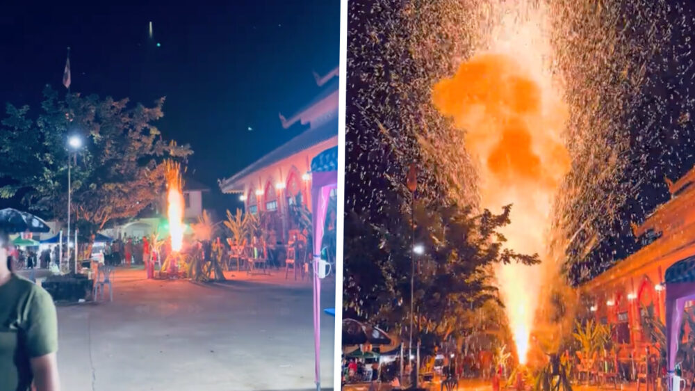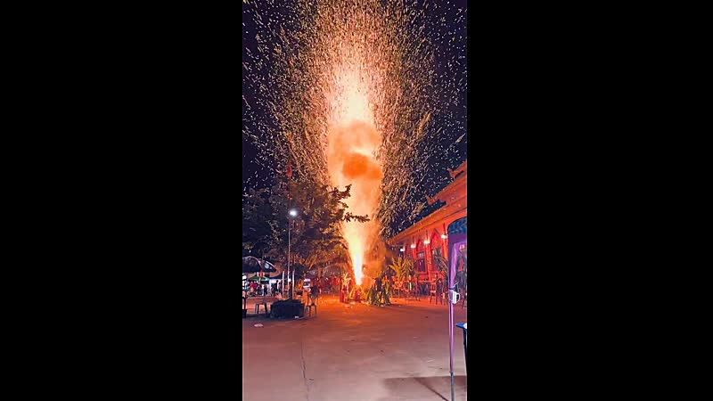 Je denkt een leuk vuurwerkje te hebben besteld, maar Thailand kennende doen ze daar alles nét even anders. Wat bij ons een Romeinse kaars is, is daar blijkbaar een mini-Saturnus V die z’n eigen baan rond de maan probeert te bereiken.