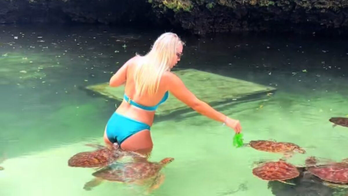 Vakantievideo van influencer verpest door iets te hongerige schildpad