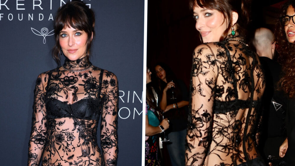 Dakota Johnson, vooral bekend van Fifty Shades-fame, kwam opdagen in een volledig doorschijnende kanten jurk, inclusief zichtbare zwarte lingerie. Tijdens het poseren gooide ze er nog een gevatte blik over de schouder tegenaan, met vol zicht op d'r achterkant.