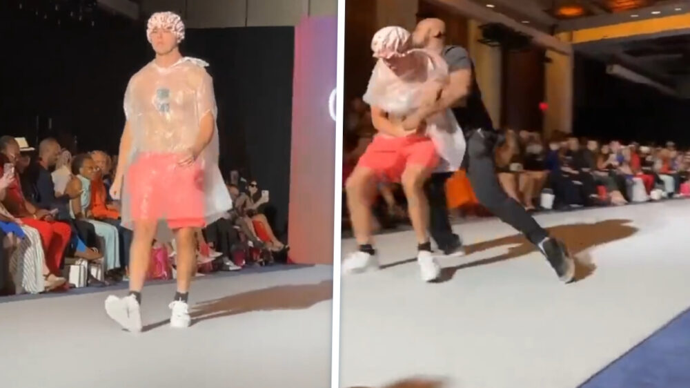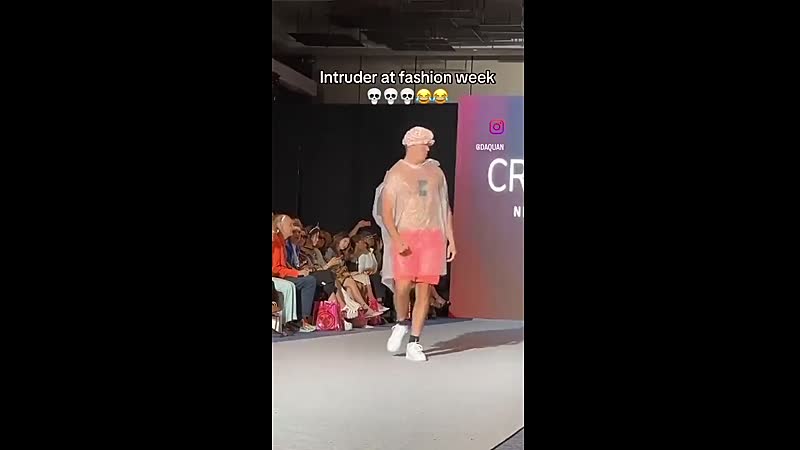 Gehuld in wat leek op een doorzichtige vuilniszak en een roze badmuts paradeerde hij doodleuk de catwalk op tijdens Fashion Week. Het publiek dacht nog even dat het een of andere gewaagde milieuboodschap was, maar de beveiliging dacht daar duidelijk anders over.