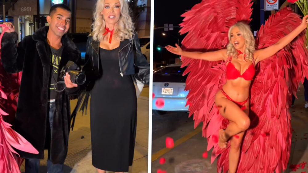 Kathy Jacobs bewijst dat je ook op 61 nog prima een showtje kunt geven op straat. Terwijl de meeste mensen van die leeftijd aan het zoeken zijn naar hun leesbril, trekt het "hoogbejaarde" supermodel doodleuk haar jurkje uit en staat ineens in bikini alsof het de meest normale zaak van de wereld is.