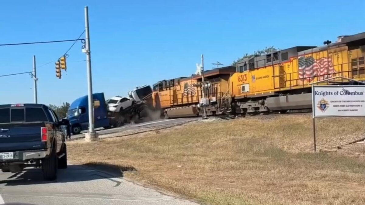 Bij ons rijden ze door vrachtwagens gevuld met peren, maar in Schertz, Texas was het een iets andere zondagochtend. Terwijl iedereen braaf naar de kerk tuft, besluit één vrachtwagenchauffeur zijn gigantische '18-wheeler' vol auto's pontificaal op het spoor te parkeren.