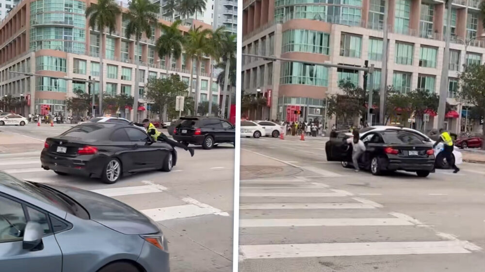 Een agent van de politie in Miami is gefilmd terwijl hij op een bestuurder schiet, terwijl hij zelf op de motorkap van diens rijdende BMW ligt. De beelden, gedeeld via instagram, laten zien hoe de agent op z’n buik over de motorkap hangt en drie keer vuurt door de voorruit. Wonder boven wonder stopt de auto en stapt de bestuurder uit met z’n handen omhoog. Even later wordt hij afgevoerd in handboeien.