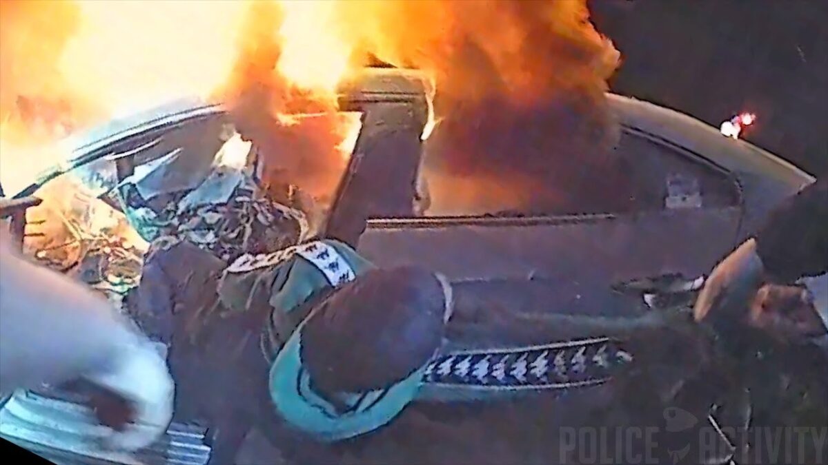 De bestuurder viel in slaap achter het stuur en knalde tegen een boom. Vervolgens komt de politie in actie om hem uit zijn brandende auto te trekken terwijl zijn been vastzit. Lekker gewerkt pik!