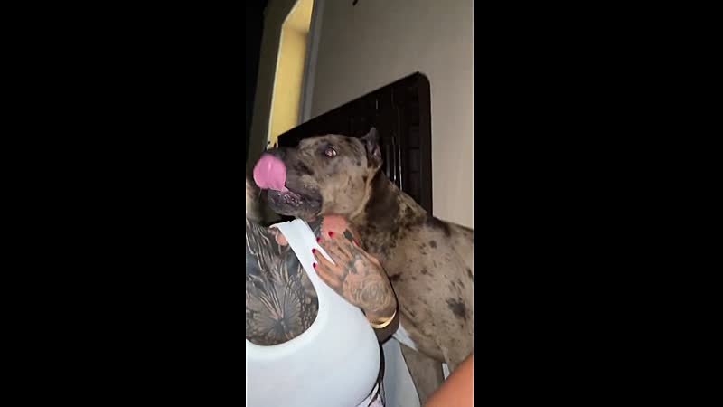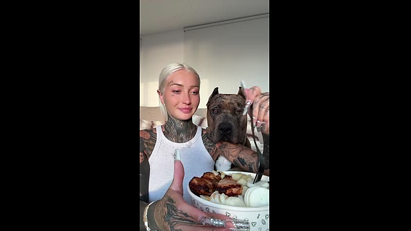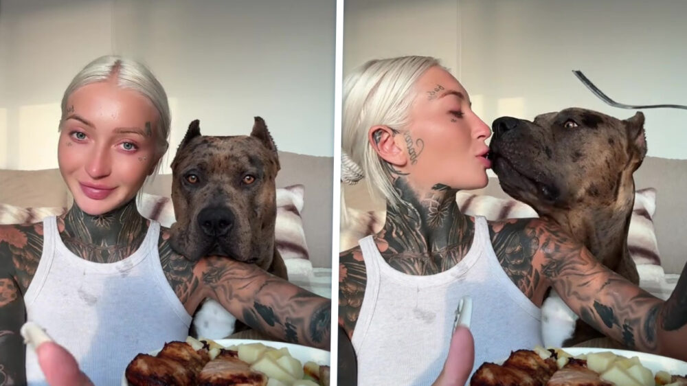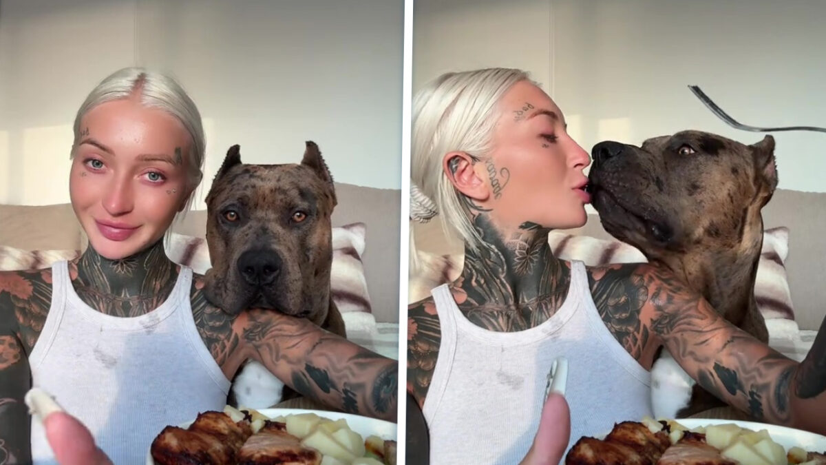 De Duitse dame die eruitziet alsof ze met een watervaste stift is ingekleurd, gaat wel héél gezellig om met haar American Bully. Zo knus zelfs, dat Brutus inmiddels waarschijnlijk denkt dat ze samen een stel zijn. Wij vertrouwen het voor geen meter, haal die pot pindakaas gewoon maar tevoorschijn...