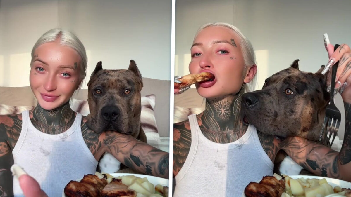 De Duitse dame die eruitziet alsof ze met een watervaste stift is ingekleurd, gaat wel héél gezellig om met haar American Bully. Zo knus zelfs, dat Brutus inmiddels waarschijnlijk denkt dat ze samen een stel zijn. Wij vertrouwen het voor geen meter, haal die pot pindakaas gewoon maar tevoorschijn...