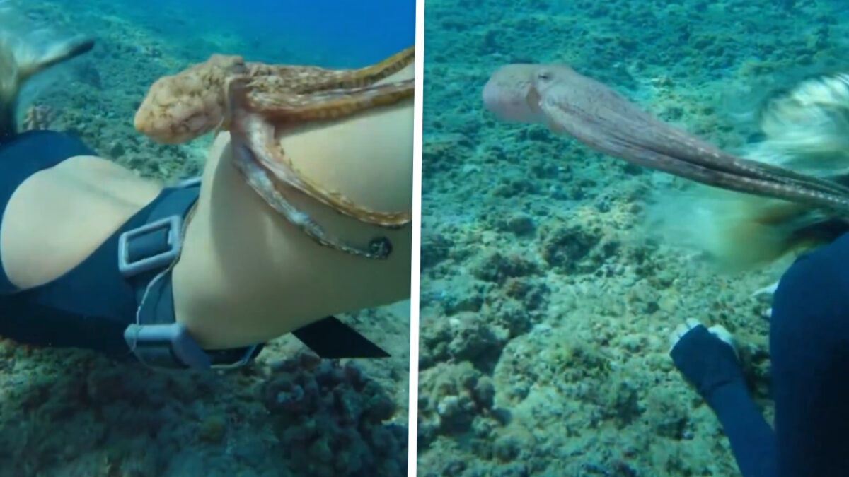 Angstaanjagend is misschien wat overdreven, want deze octopus had vooral interesse in één specifiek deel van de duikster. Terwijl zij rustig verder zwemt, grijpt meneer met zijn grijpgrage tentakels zijn kans en klampt zich charmant vast. De duikster blijft opvallend relaxed, klasse hoor!