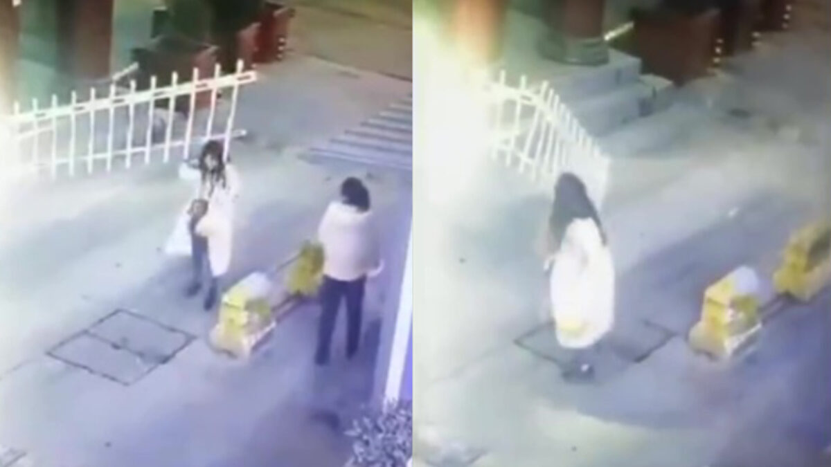 Aziatische dame besluit wraak te nemen op de slagboom die haar op haar hoofd raakte