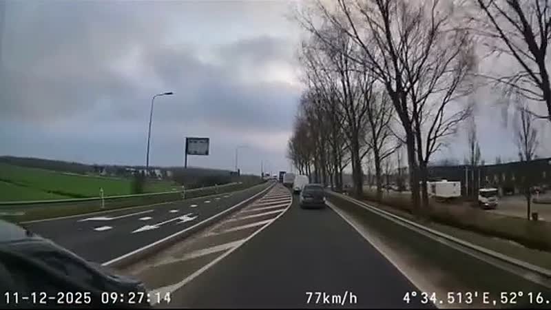 Sommige mensen zien een verdrijvingsvlak niet als waarschuwing, maar als uitnodiging. Dit busje pakt het verdrijvingsvlak letterlijk op het allerlaatste moment mee en dwingt een vrachtwagenchauffeur tot een noodstop waar je ABS van begint te zweten.