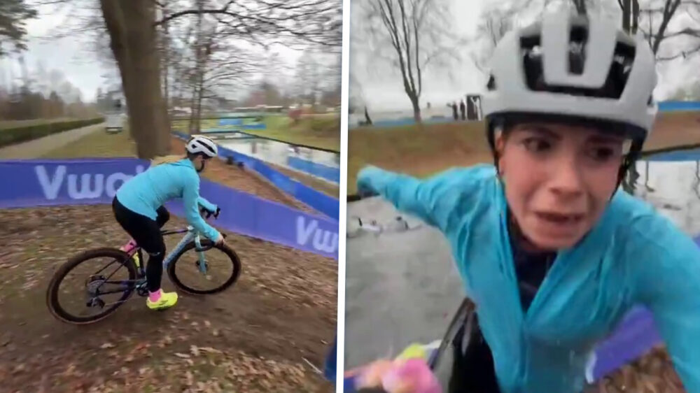 Een rondje warmdraaien liep voor Belgische influencer Stien iets anders dan gepland. In plaats van strak door de bocht te knallen, schiet ze rechtdoor en maakt ze een sierlijke koprol het water in.