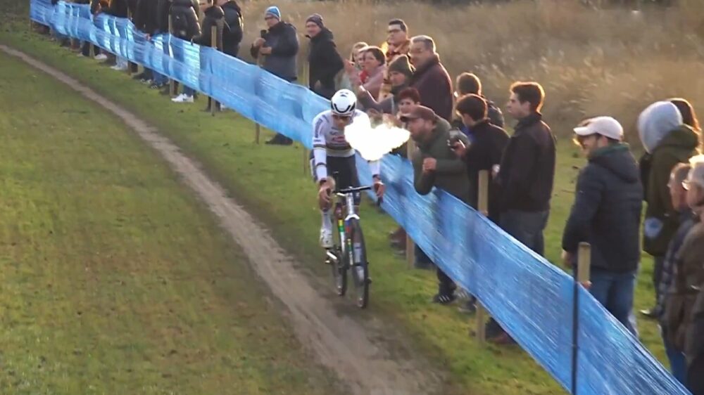 Mathieu van der Poel is maandag tijdens een veldrit in het Belgische Hofstade opnieuw lastiggevallen door een toeschouwer. Terwijl hij bezig was aan een solorace, blies een man opzettelijk een grote wolk damp uit een vape in het gezicht van de Nederlander. Van der Poel reed ongestoord door en won de race.