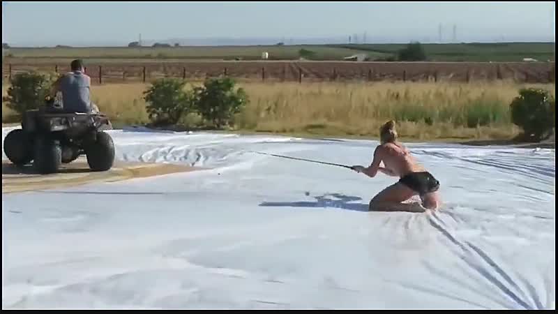 Een groot zeil, een paar liter glibbermiddel, twee ietwat overmoedige dames in bikini en een klein beetje hulp. Meer heb je eigenlijk niet nodig.