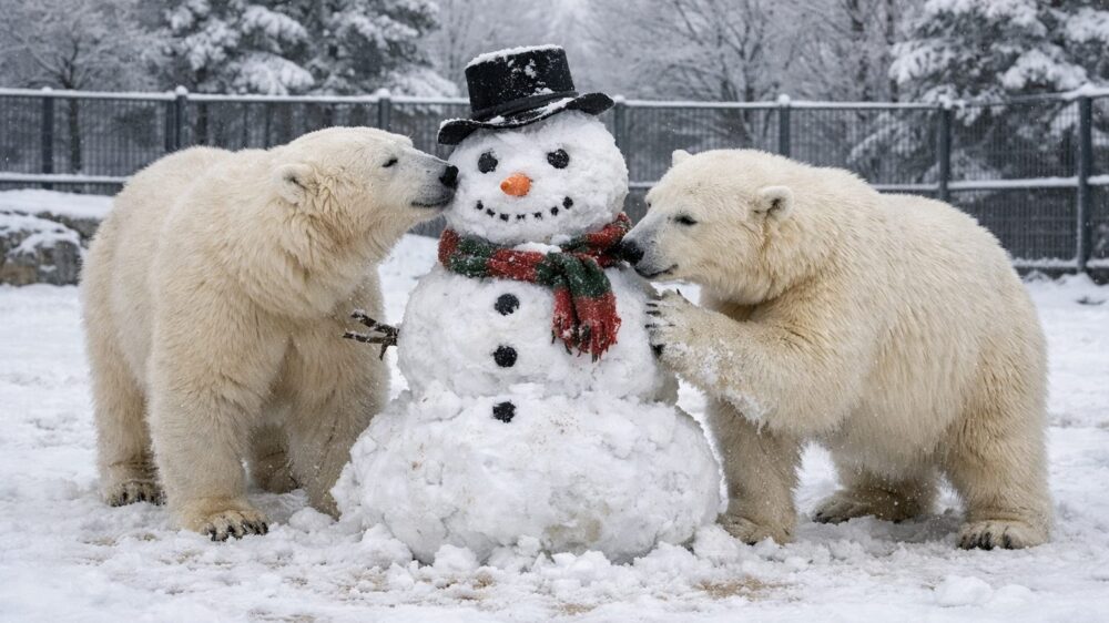 IJsberen in Eindhoven op een sneeuwpop met lading snacks getrakteerd