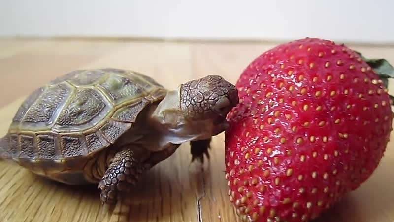 Schattig schildpadje moet een immens grote aardbei zien weg te werken
