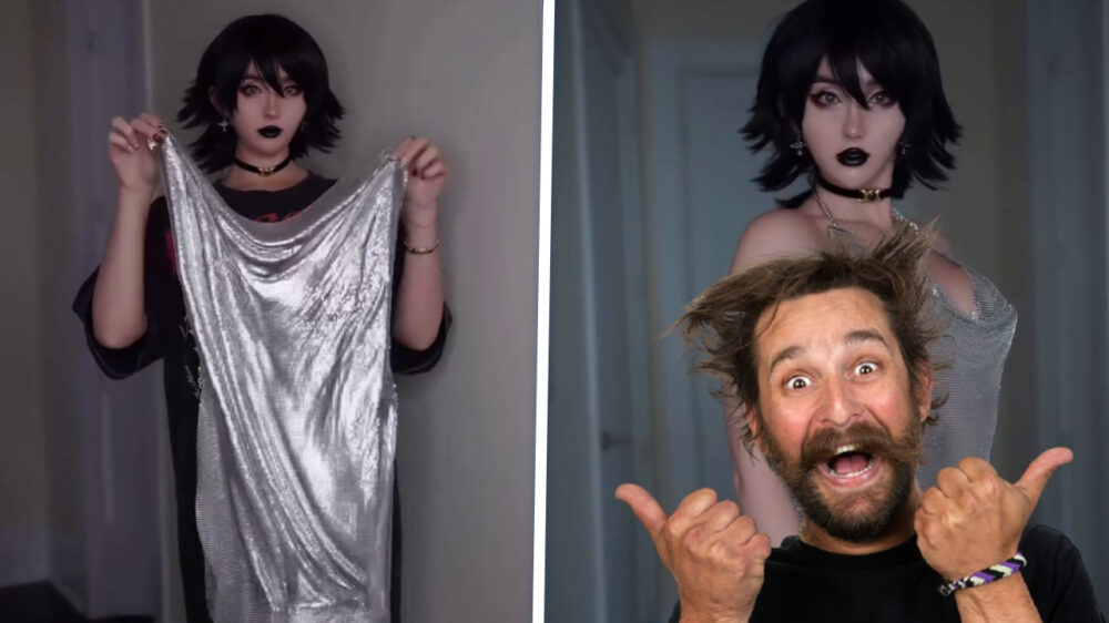 Een Gothic dame past een viral jurkje en het begint allemaal weinig veelbelovend. Eerst verschijnt ze in een oversized zwart shirt en houden we ons hart even vast. Maar zodra het jurkje om haar heen klapt, blijkt dat we ons ernstig vergist hebben. Hoppa, ineens staat er iemand waarvan je spontaan begrijpt waarom dit ding viraal gaat!
