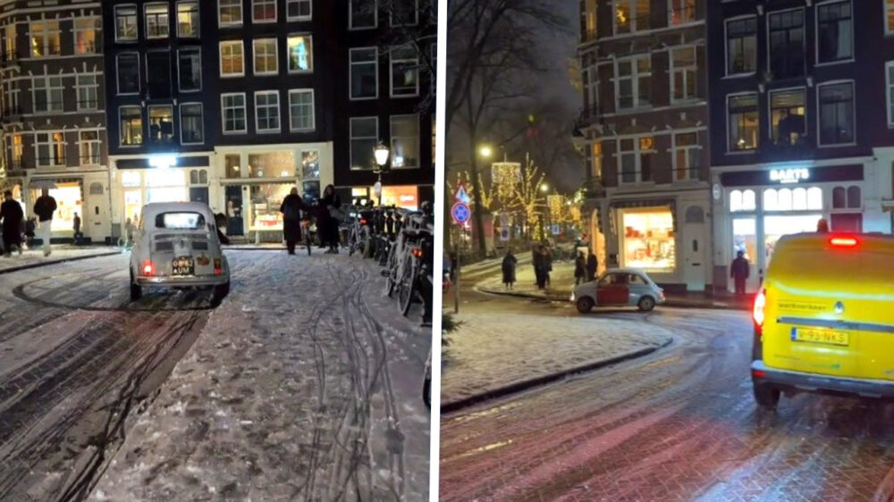 Hipster op zomerbanden glijdt met Fiat 500 door winters Amsterdam