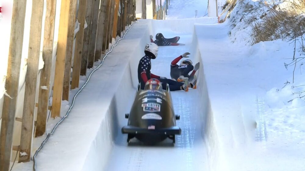 Het Amerikaanse bobsleeteam dacht even soepel richting beneden te glijden, maar vergat één klein detail: je moet wel met z’n allen blijven zitten.