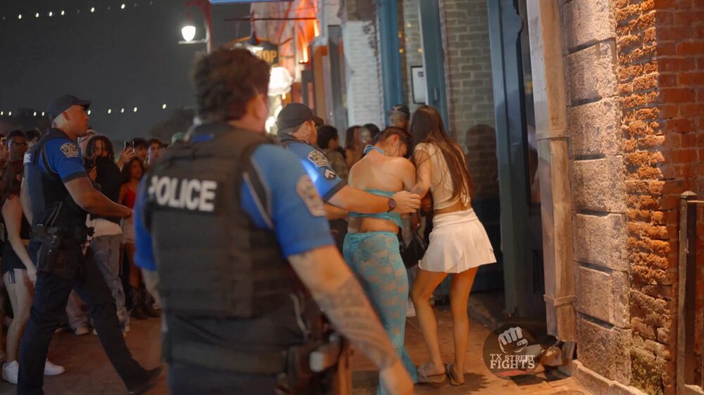 Een ordinair straatgevecht ergens in Texas, half TikTok, half kroegdrama, compleet met publiek dat nét iets te dicht op de actie staat.