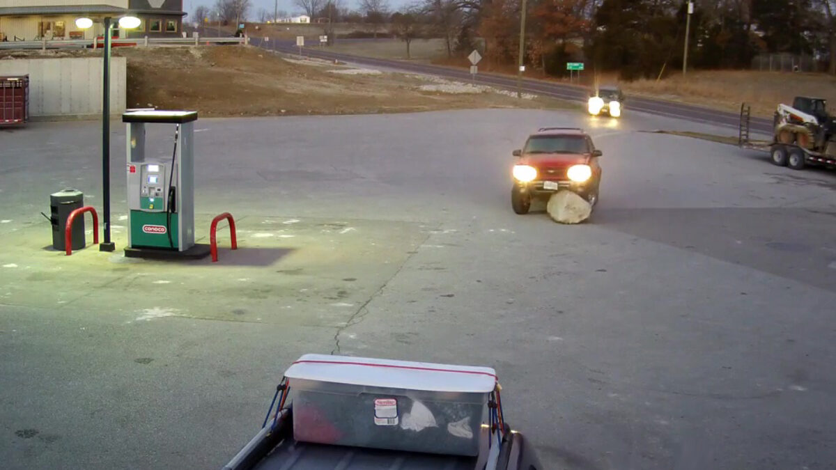 Autobestuurder kiest een keislechte route richting benzinepomp Fails