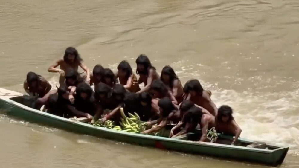 In de video komen de stamleden gewapend uit de dichte begroeiing tevoorschijn waarin te zien is hoe de mannen hun wapens laten zakken, vlak voordat ze een kano gevuld met voedsel krijgen aangeboden. De groep krijgt onder meer bananen en een boot aangeboden en reageert daar zichtbaar enthousiast op.